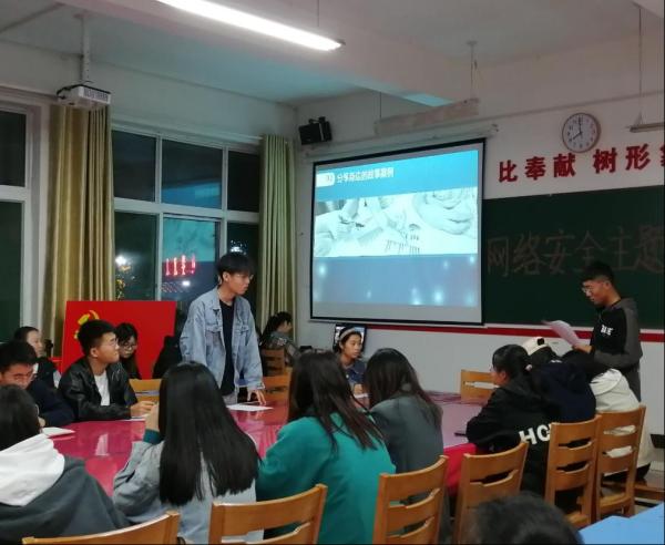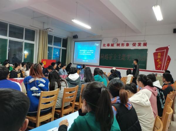 为深入学习贯彻习近平总书记关于网络强国的重要思想,提高学生们的网络安全意识,我系学生第一、二支部于2021年10月15日晚七点半在综A教学楼308召开“网络安全为人民,网络安全靠人民”的主题党日活动,本次大会由王丽丽老师主持,40名学生党员同志参加。