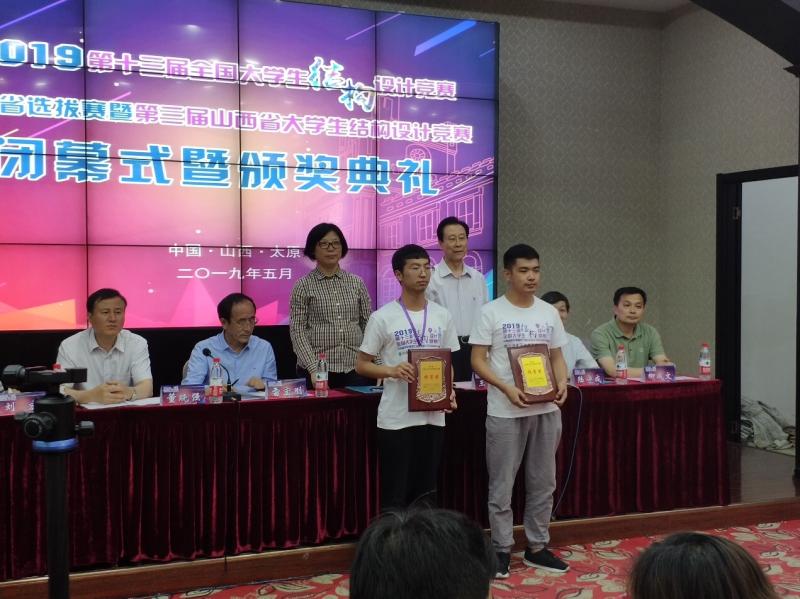 5月26日,为期四天的第十三届全国大学生结构设计竞赛暨山西省第三届大学生结构设计竞赛在山西大学胜利落幕,在我系高树峰主任、崔彩萍副主任、宋季耘老师、闫晓彦老师、胡晓红老师、五位老师的共同指导下,由邓义、游志茹、左峰、乔康乐、杜万里、贾思聪、滕杰、杨晟、安鹏杰九位同学组成的必威西汉姆联参赛队发挥出色,在全省13所高校的32支代表队伍中脱颖而出,荣获特等奖(第一名)、二等奖、三等奖的好成绩;并且获得代表山西参加全国总决赛的资格。