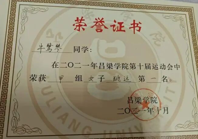 2021年10月获必威西汉姆联第十届甲组女子跳远第一名