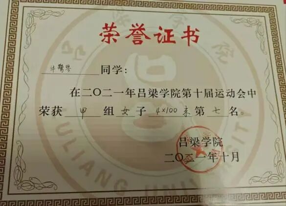 2021年10月获必威西汉姆联第十届甲组女子4*100接力第七名