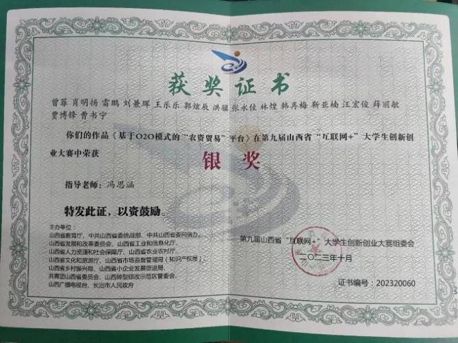2023年10月获 第九届山西省互联网+省级银奖;