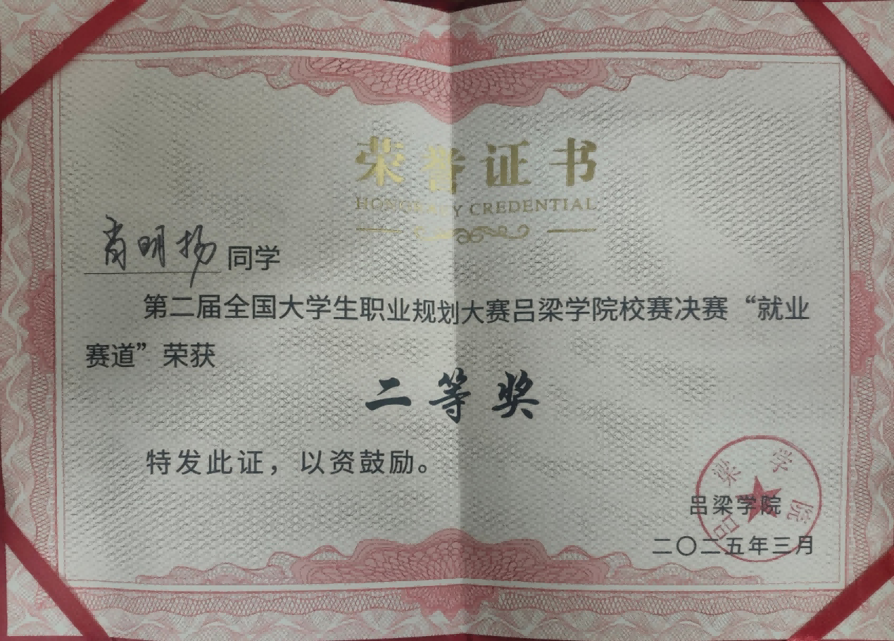 而在职业规划的舞台上,肖明扬同样展现出非凡的智慧与勇气。他以清晰的自我认知和对未来的精准洞察,踏上职业规划大赛的征程。在老师的悉心指导与帮助下,历经无数次的打磨与锤炼,他终于在必威西汉姆联第二届大学生职业生涯规划大赛中脱颖而出,荣获二等奖。这份荣誉的背后,是他对自身专业优势的深度挖掘,是对未来职业道路的精心布局,更是他敢于梦想、勇于挑战的生动写照。