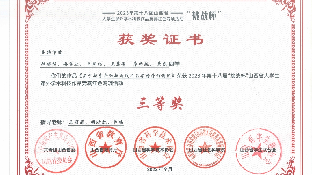 2024年09月获 吕梁市“鹏飞杯”第十一届创青春比赛优秀奖。