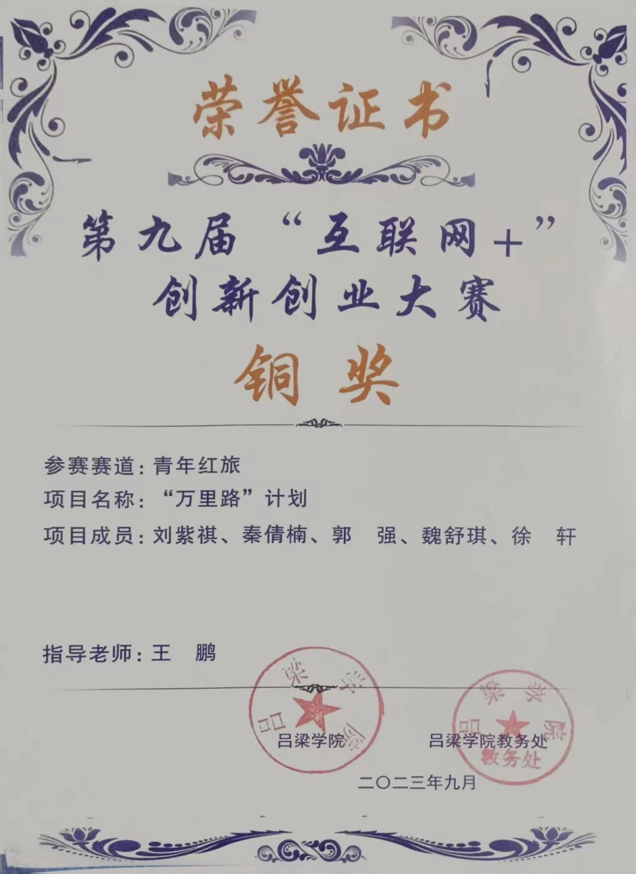 2023年09月获 第九届互联网+创新创业大赛校级 铜奖。