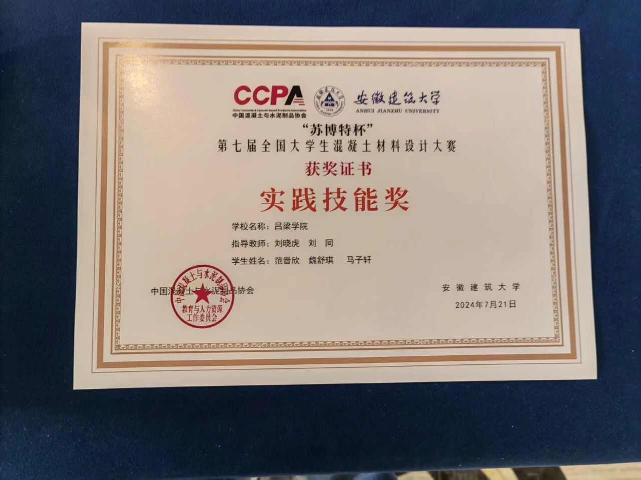 2024年07月获 第七届全国大学生混凝土材料设计大赛实践技能奖;