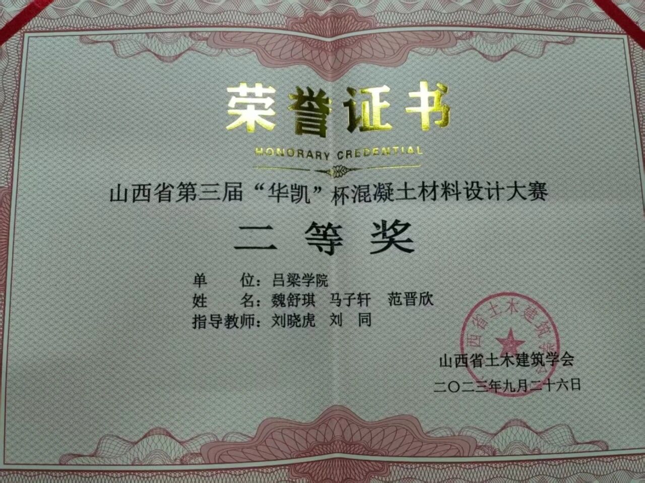 2023年09月获 山西省第三届“华凯”杯混凝土材料设计大赛二等奖;
